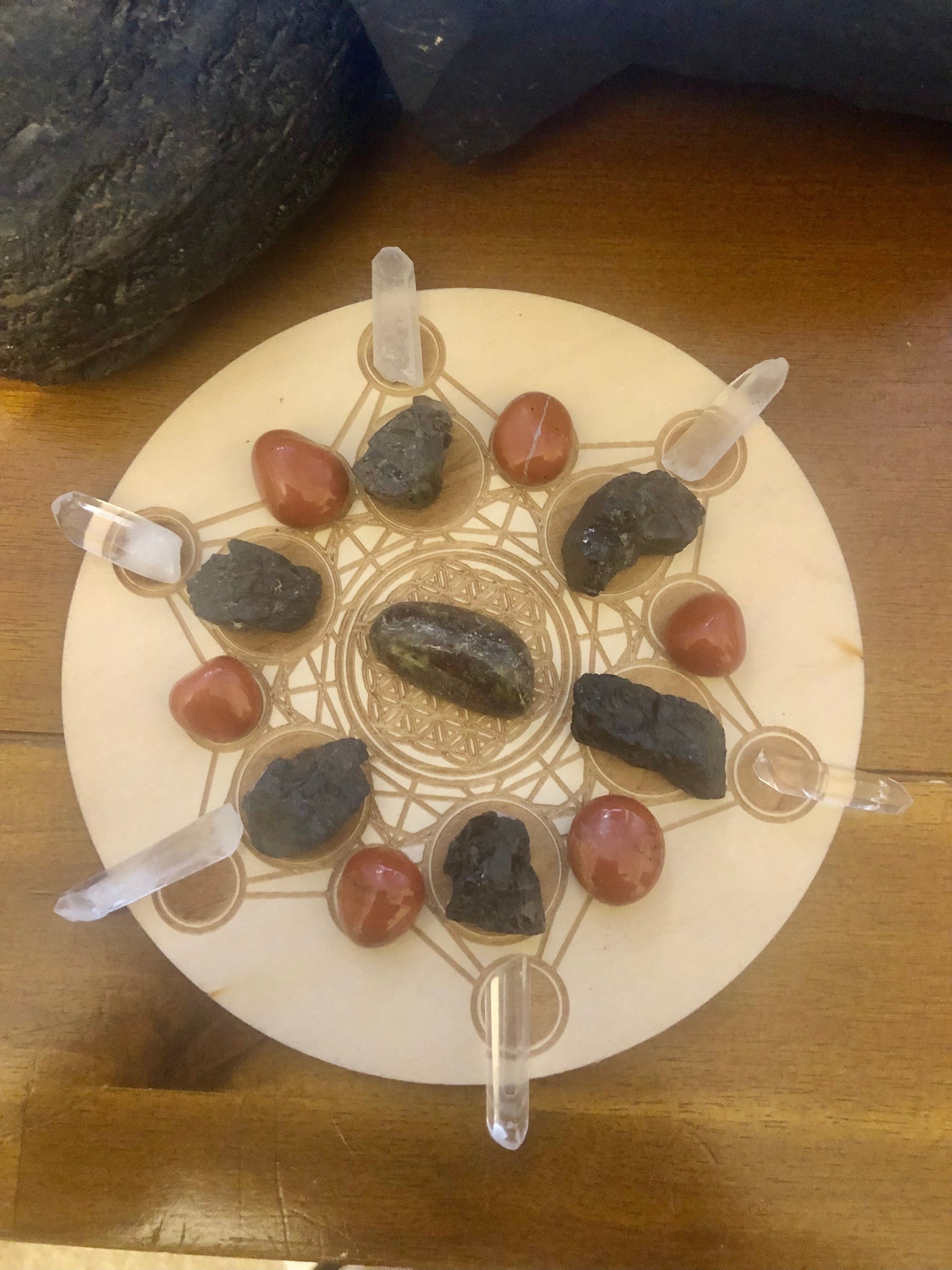 This protection grid combines black tourmaline for powerful grounding and shielding from negative energy, red jasper for strength, stability, and physical protection, and clear quartz to amplify the grid’s protective intentions. Together, they create a strong energetic barrier that promotes courage, resilience, and clarity while keeping unwanted influences at bay. This grid is 15 cm edge to edge.